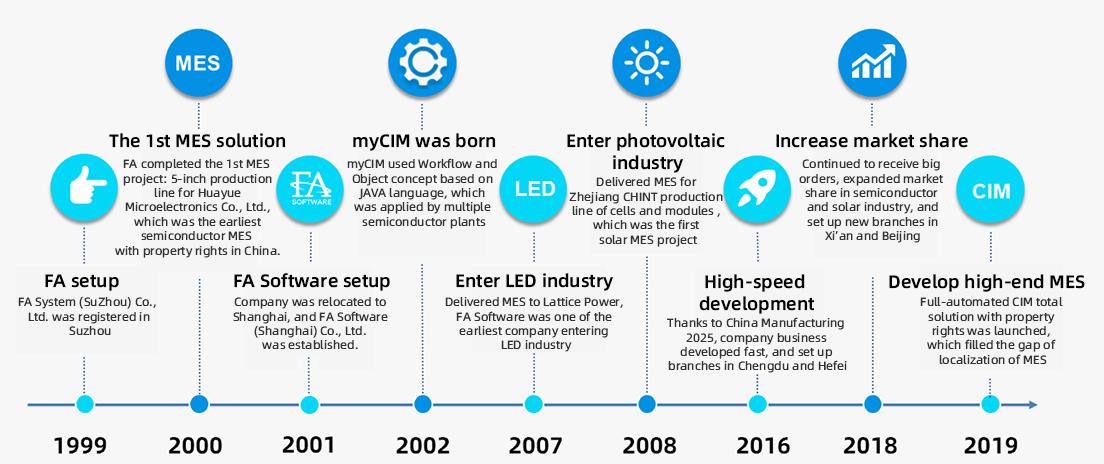 Since its establishment in 1999, FA software has cultivated semiconductor, solar and LED industry, and delivered software solutions to numerous industry-leading companies. FA software has multiple subsidiaries in Chengdu, Hefei, Beijing, Xi’an, Wuhan, Singapore and Malaysia with its headquarter located in Shanghai, and grows to 250 employees. New product myCIM 4.0 launched in 2019 fills the gap of localization of MES applied in 12-inch semiconductor production lines, which makes FA software to become the first local software company owing independent intellectual property rights of full-automatic semiconductor CIM software.