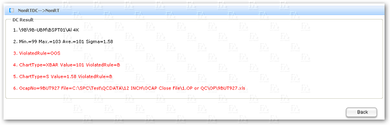 FA SPC supports both counting and metered SPC control charts, including, but not limited to: counting mean-extreme control chart (XBar-R chart)/average-standard deviation control chart (XBar-S chart), single-value-moving extreme control chart (X-MR chart), metered nonconformity rate control chart (P chart), nonconformity number of product charts (NP charts), defect control charts (C charts), unit defect control charts (U charts), and other SPC charts (e.g. Box Plot, Histogram, Scatter, Pareto, Normal Risky Plot, etc.), while FA SPC can take measures such as alarms, sendmails to relevant departments, Hold Lot, Hold Equipment, etc.